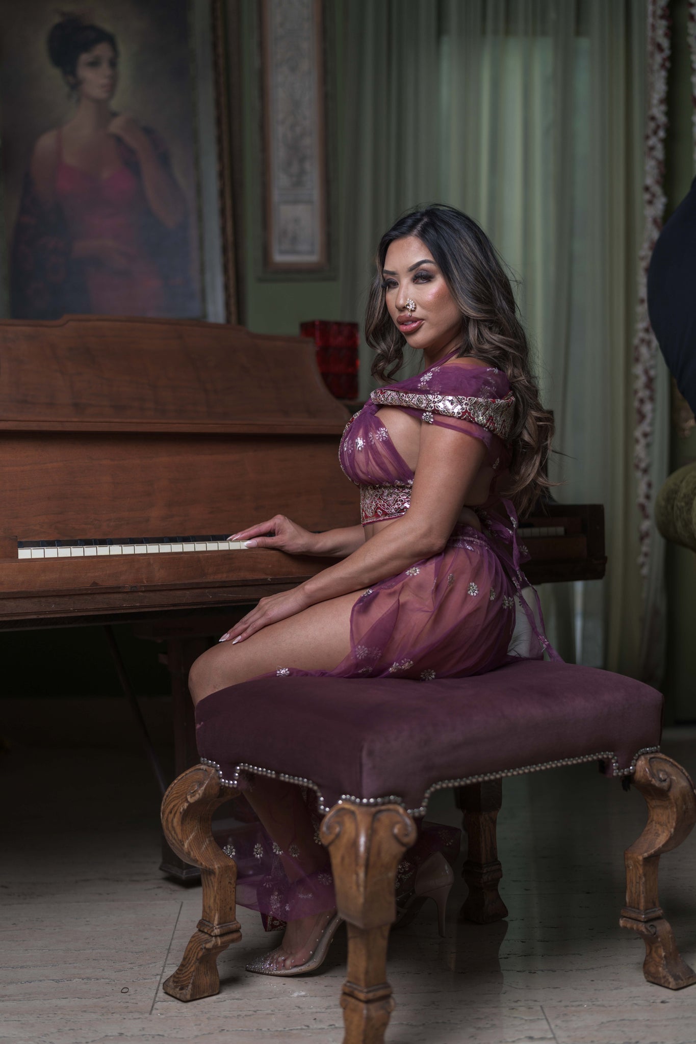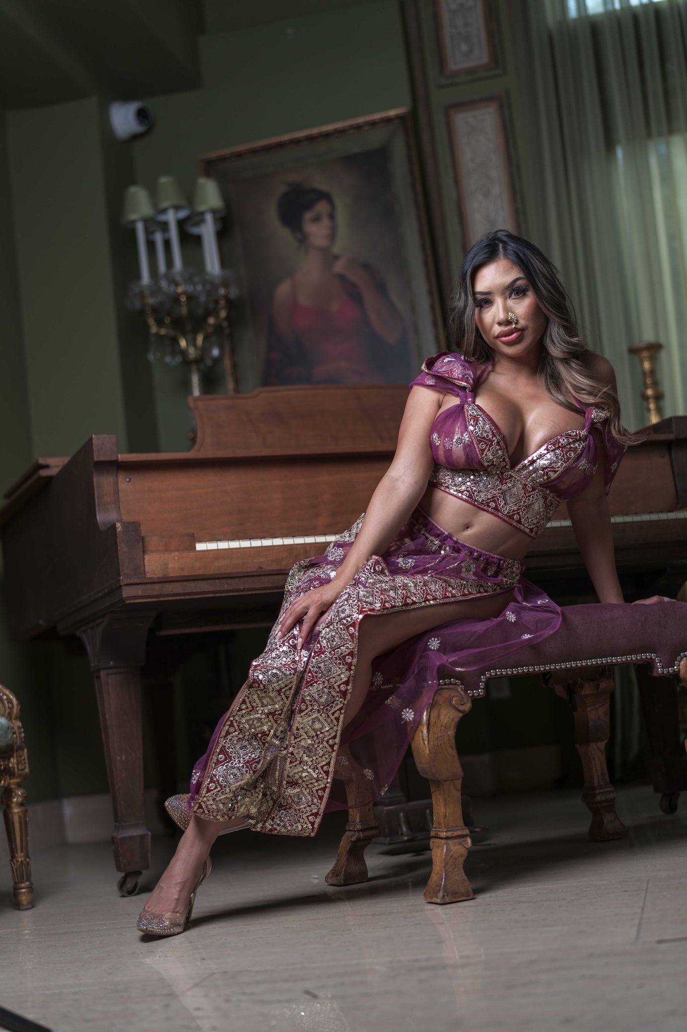 jasmine top features hood or off shoulder jasmine look. top ties behind neck and back to fit custom to your curves.