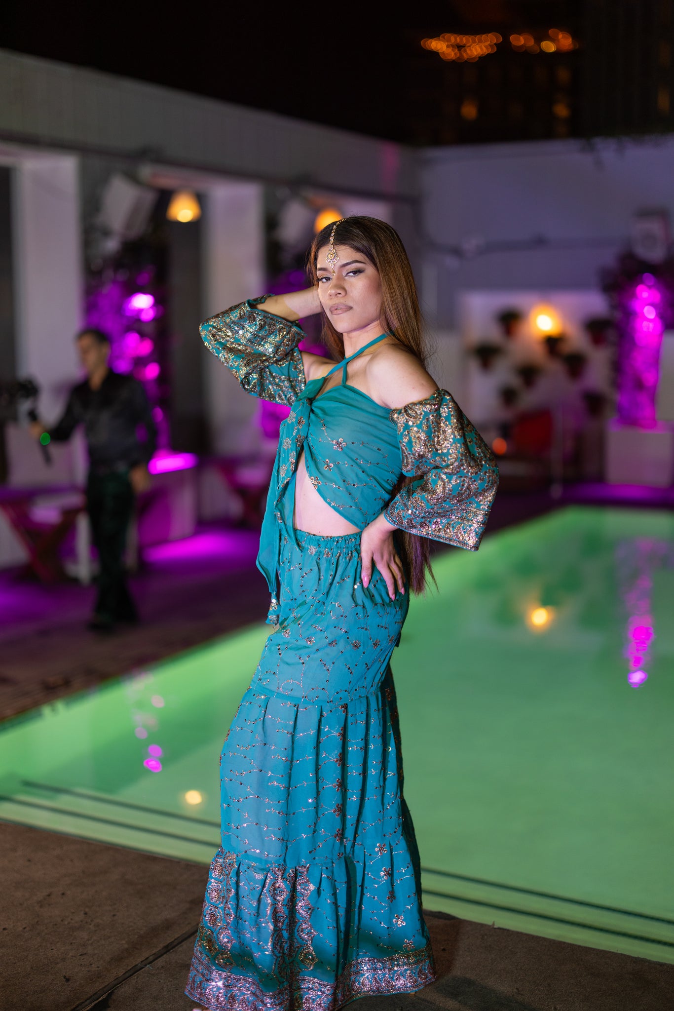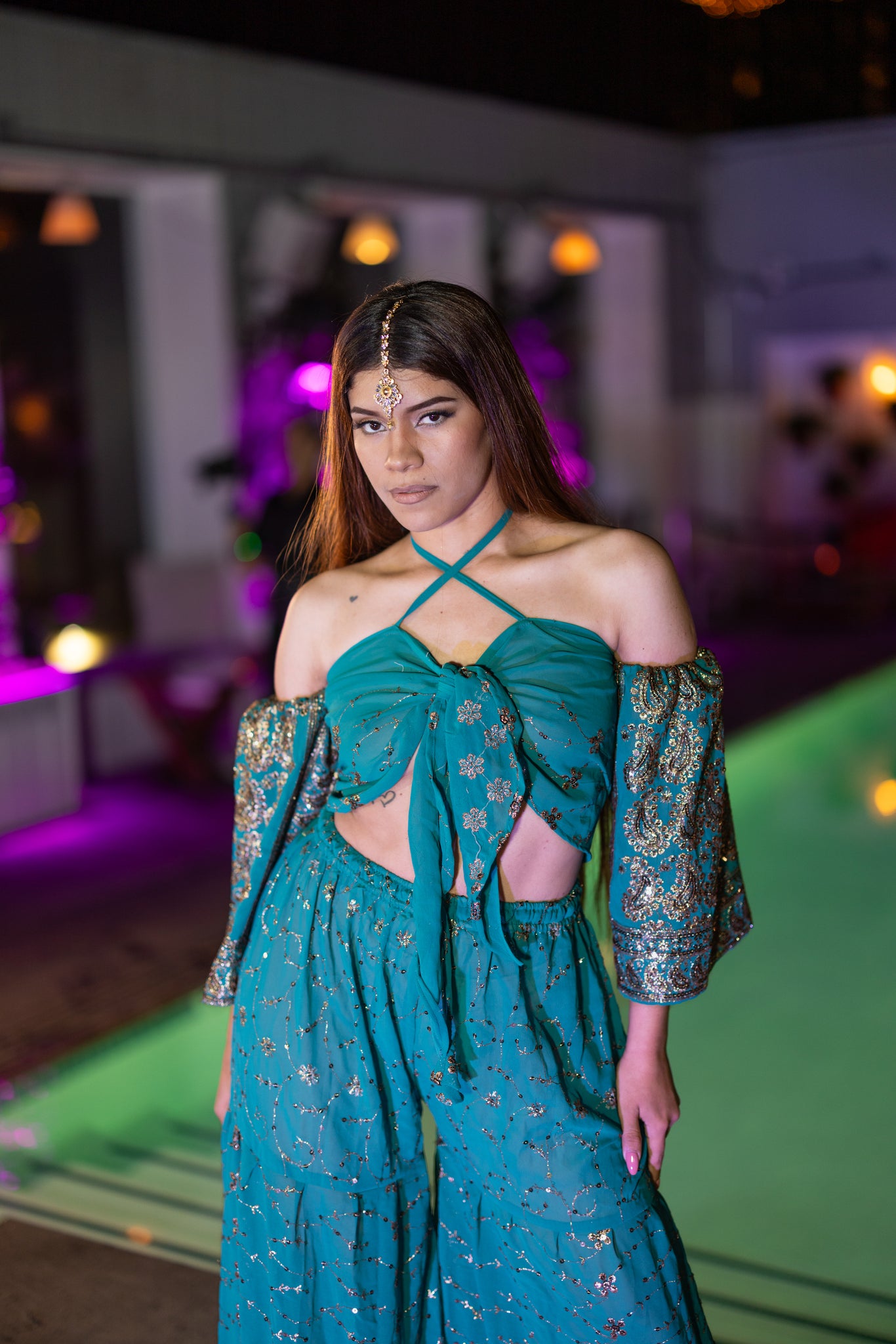 • Load image into Gallery viewer, Golden turquoise sharara pants set