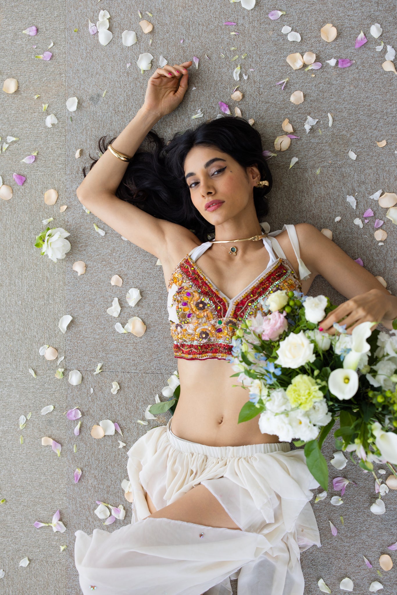 Butterfly inspired layered skirt, short in the front and long in the back. Layered handmade panels all along the skirt