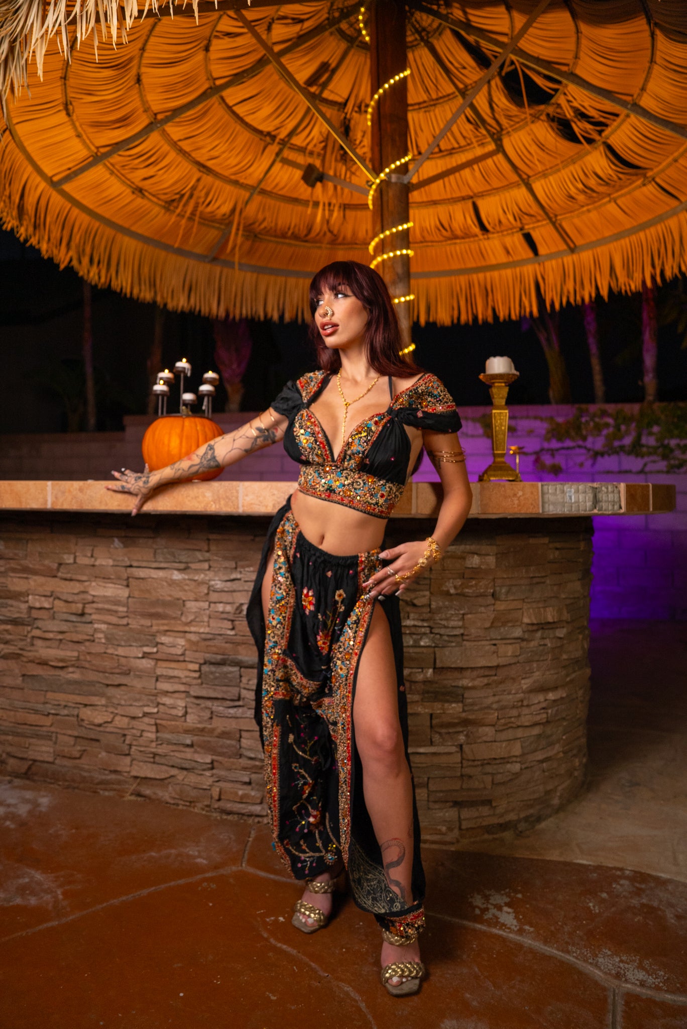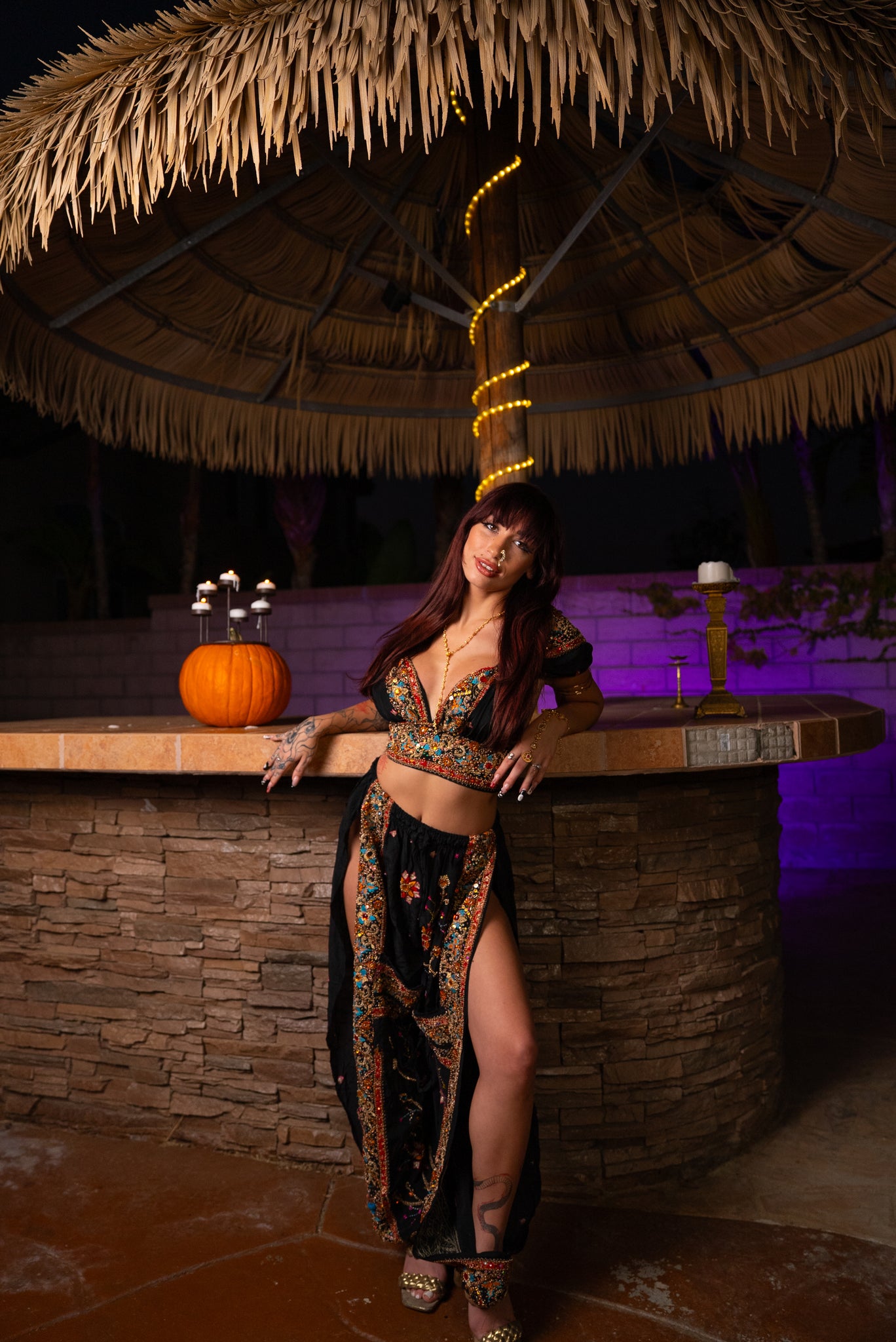 jasmine top features hood or off shoulder jasmine look. top ties behind neck and back to fit custom to your curves.