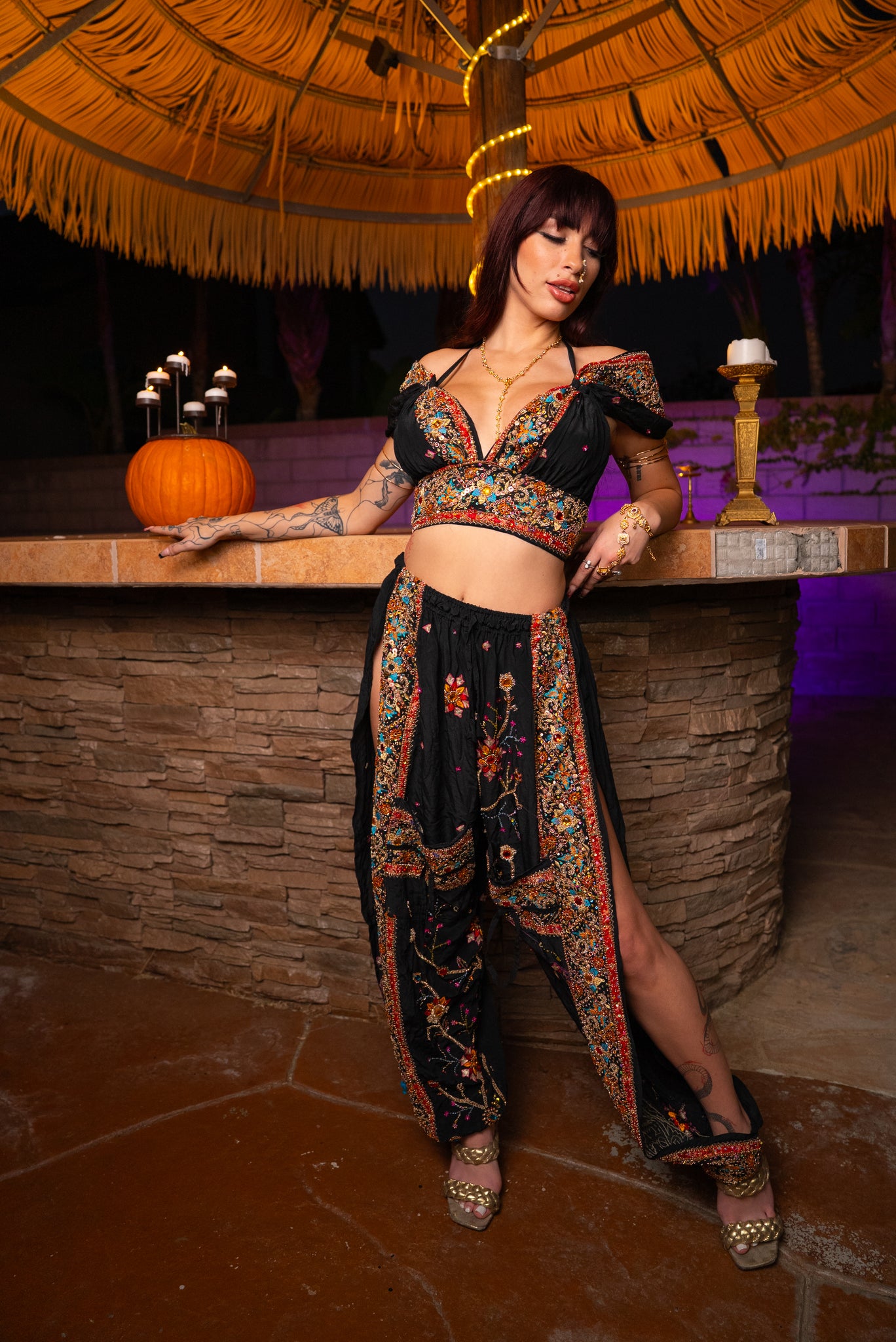 slit pants feature an elastic waistband with a drawstring to adjust to your curves. slits on each side, and pocket on front of each leg.