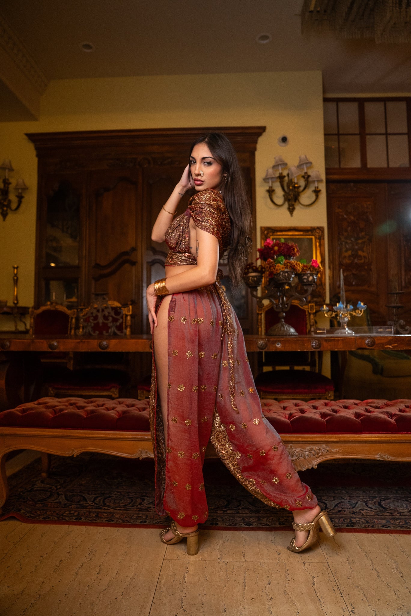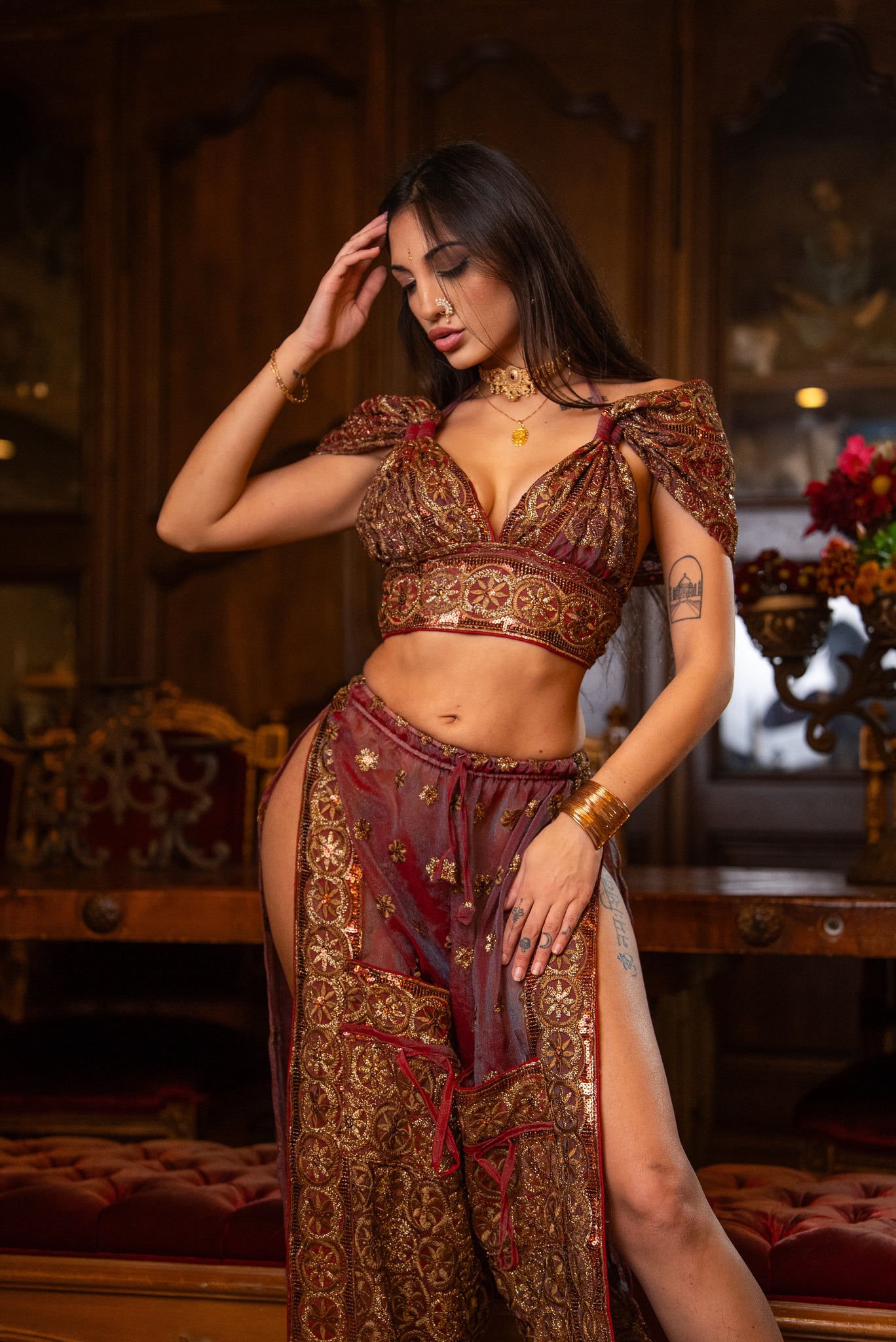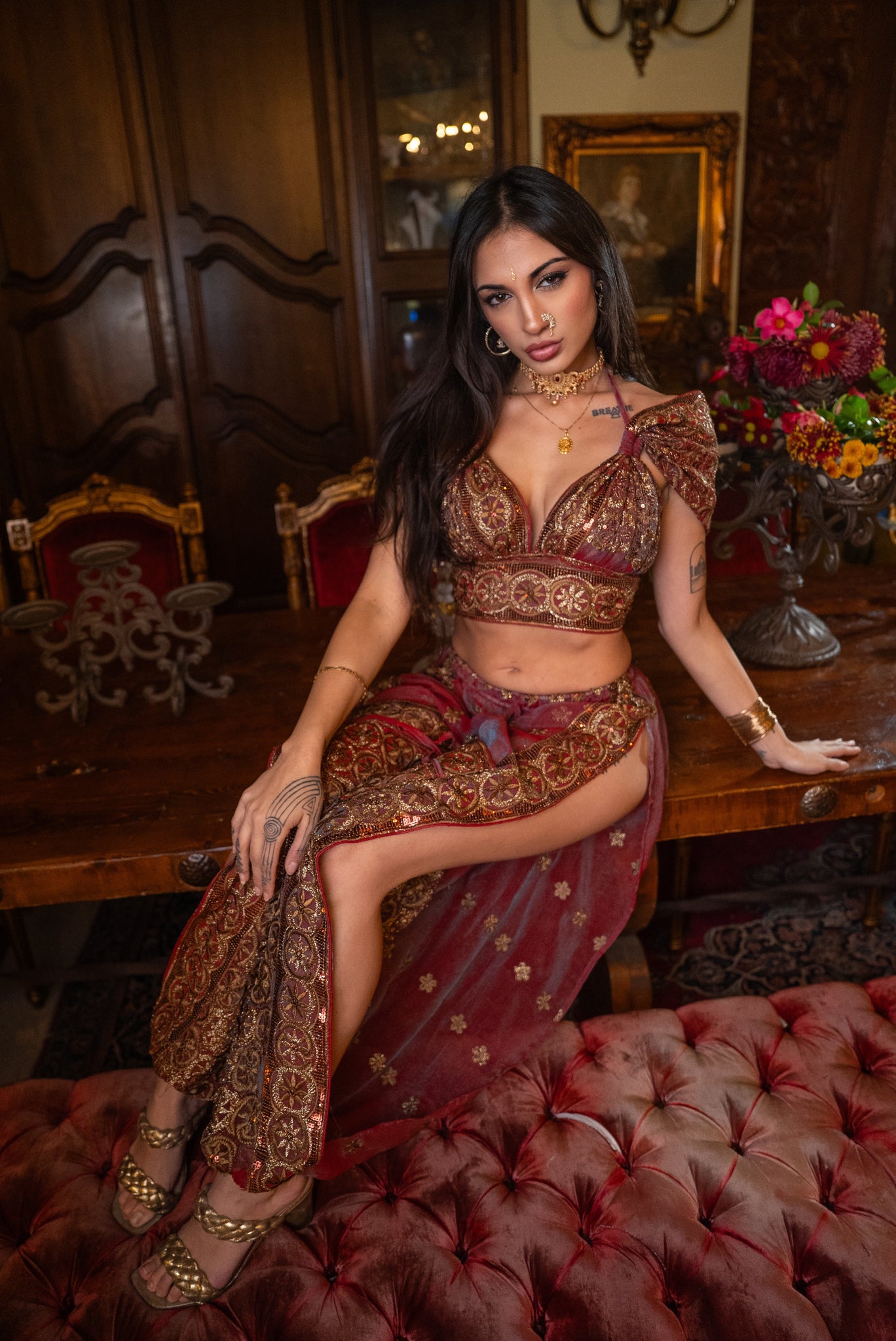 jasmine top features hood or off shoulder jasmine look. top ties behind neck and back to fit custom to your curves.