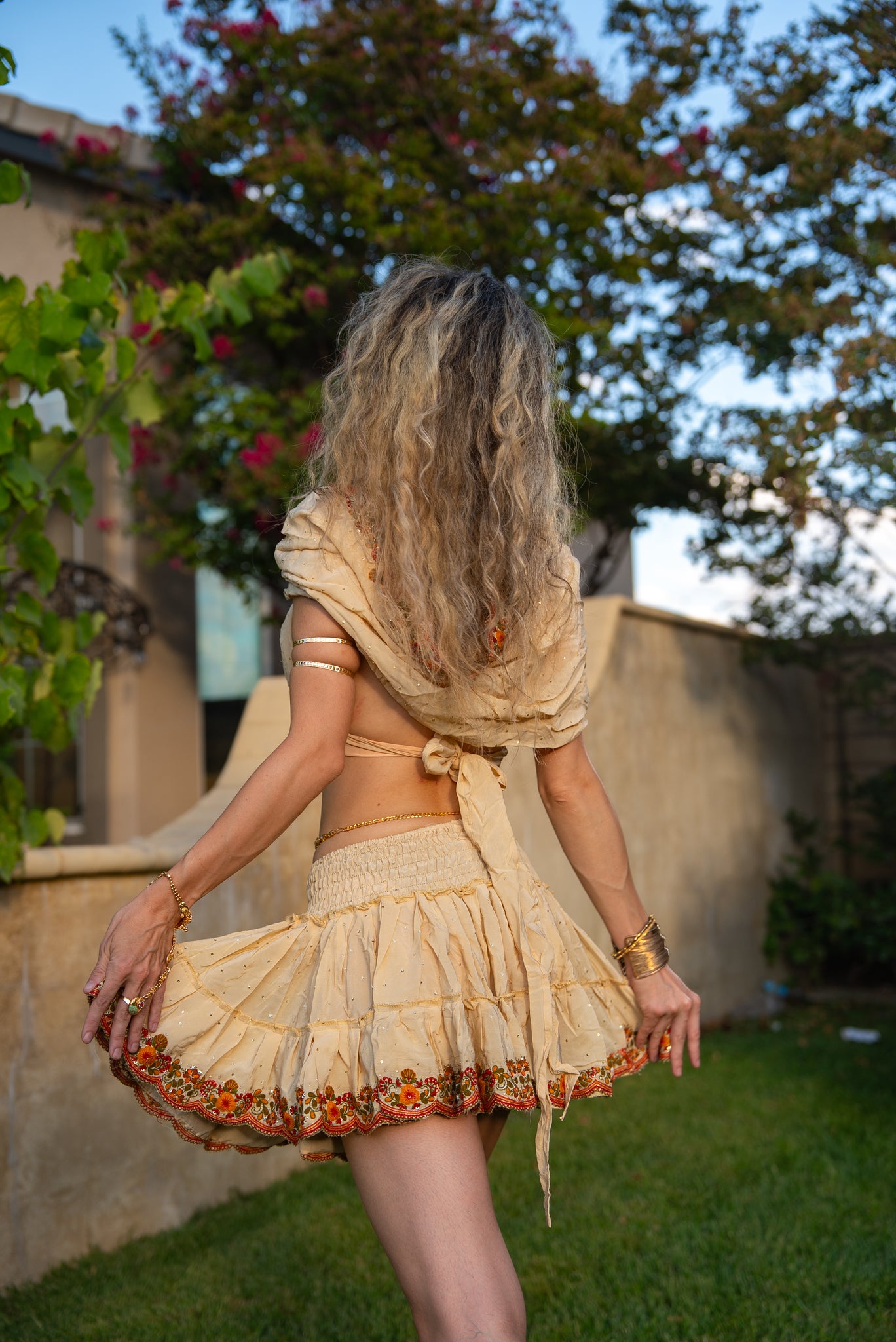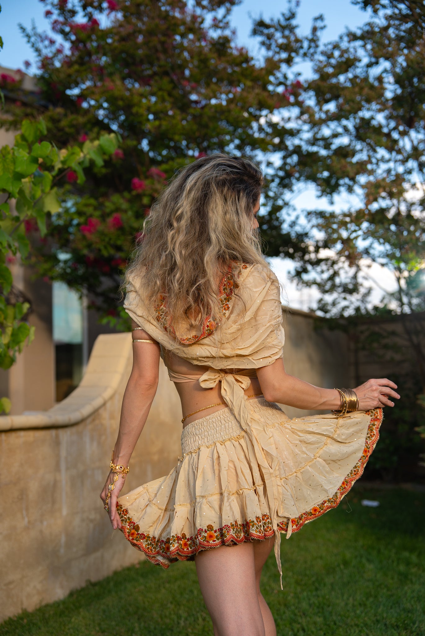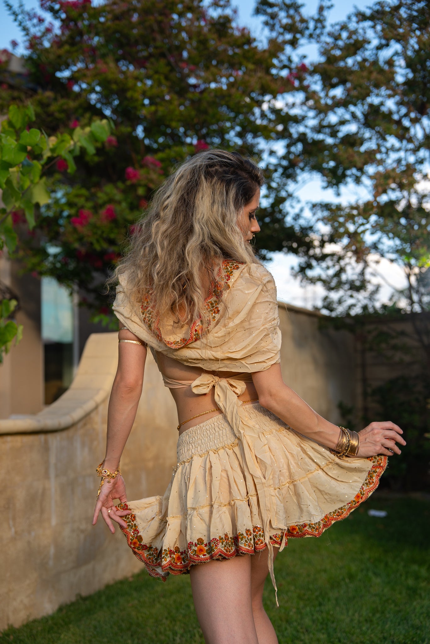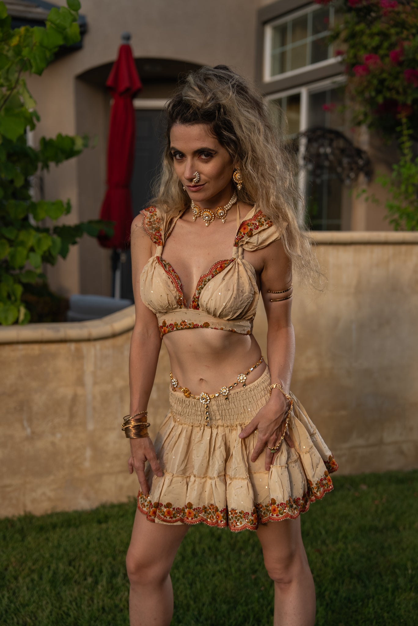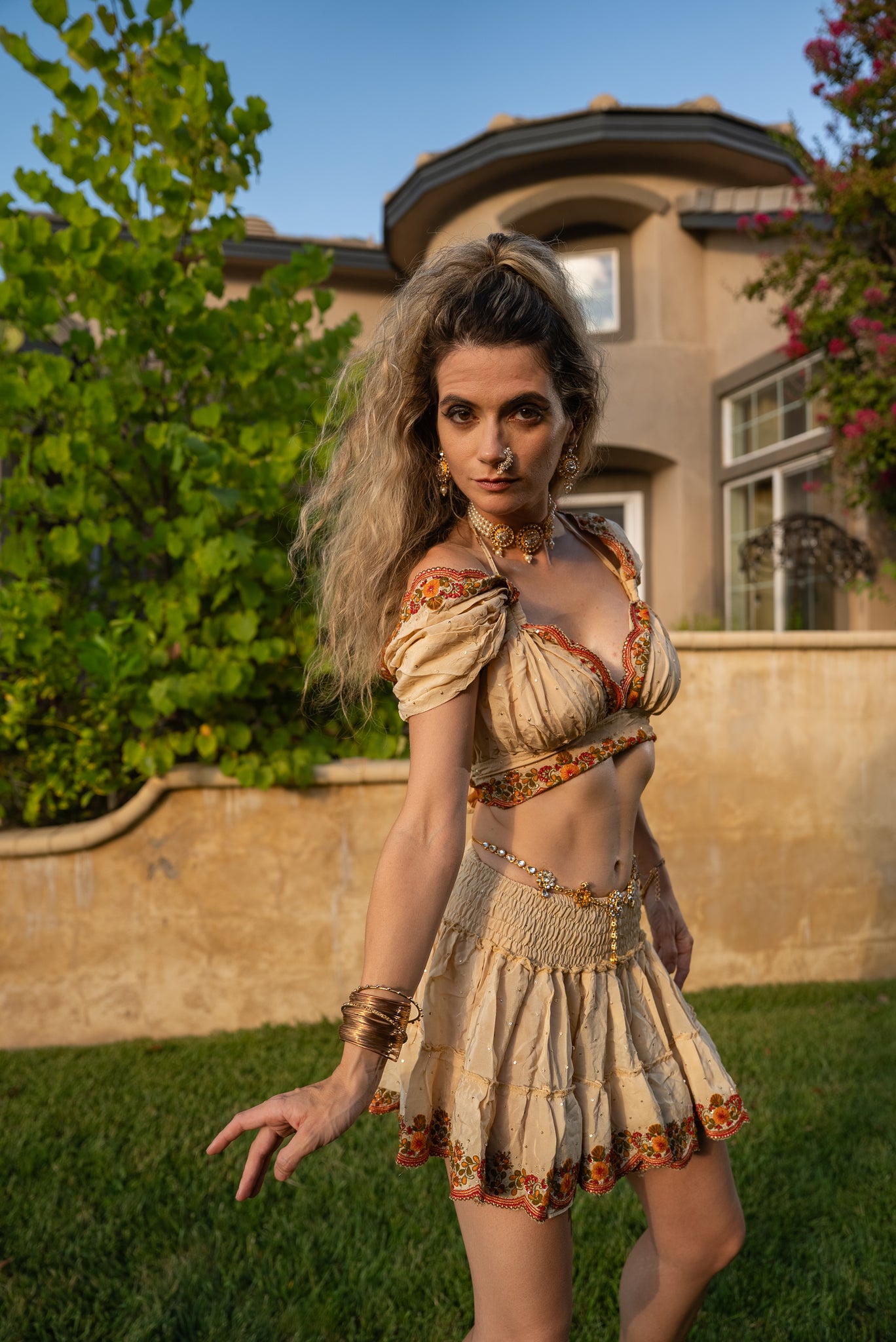 one of a kind up cycled vintage saree two-piece mini skirt set