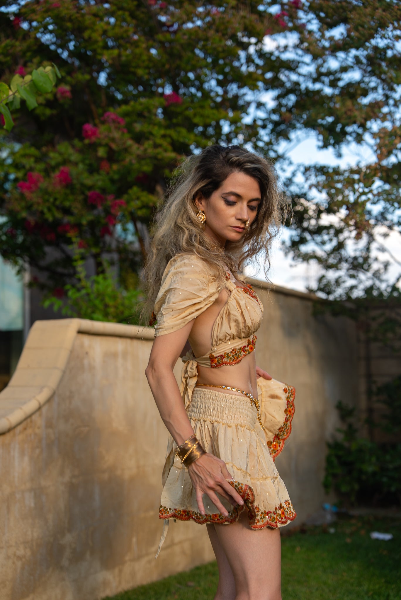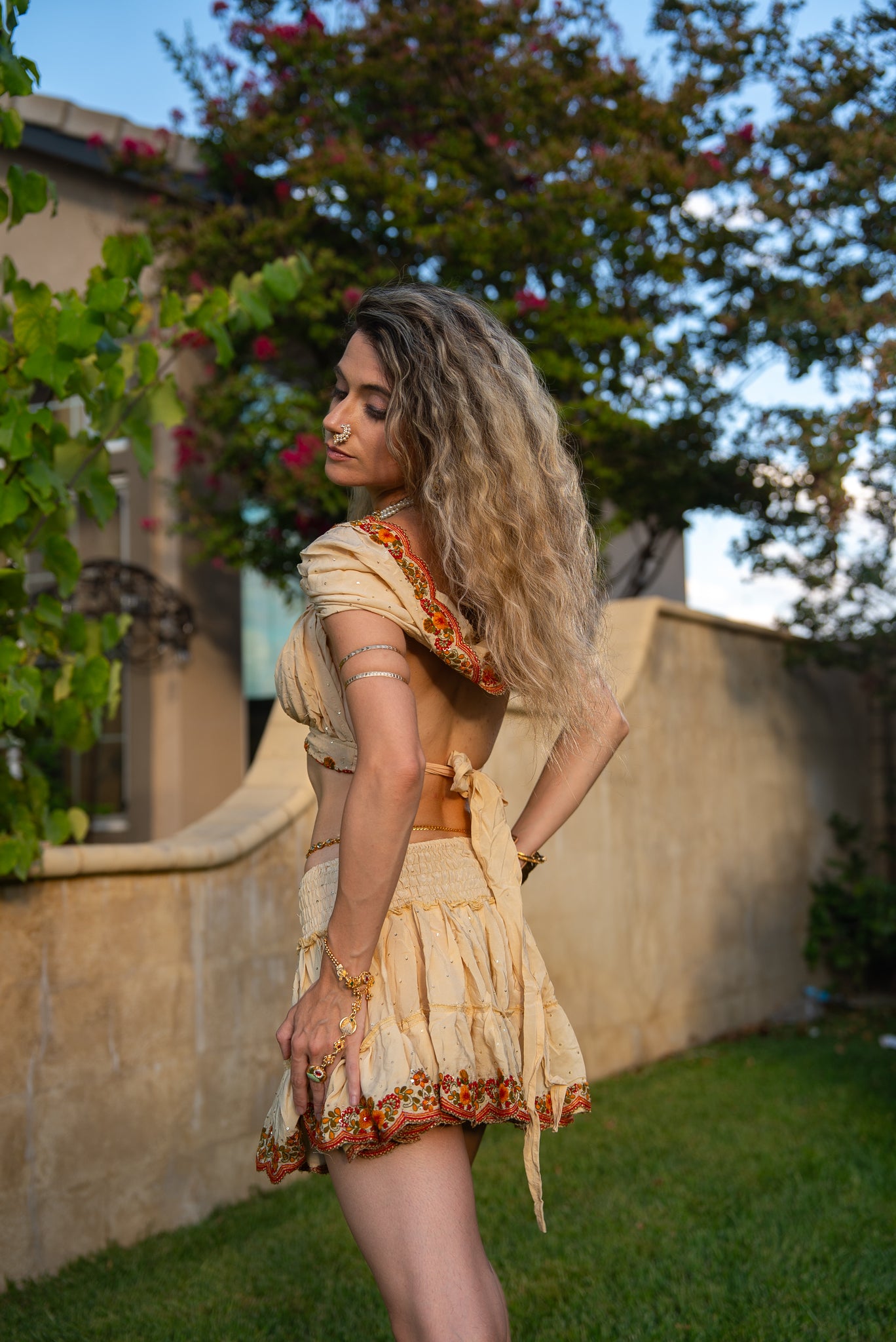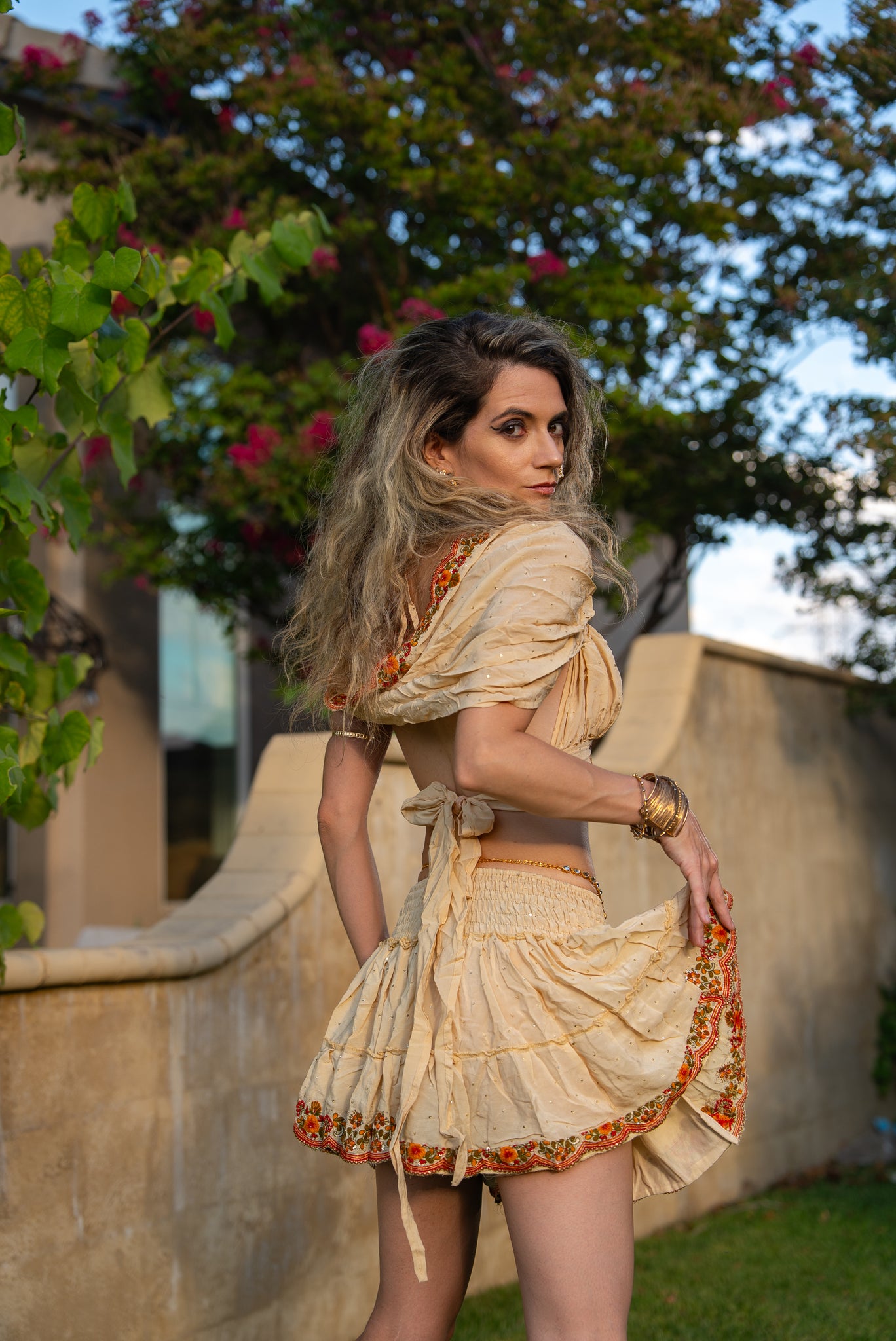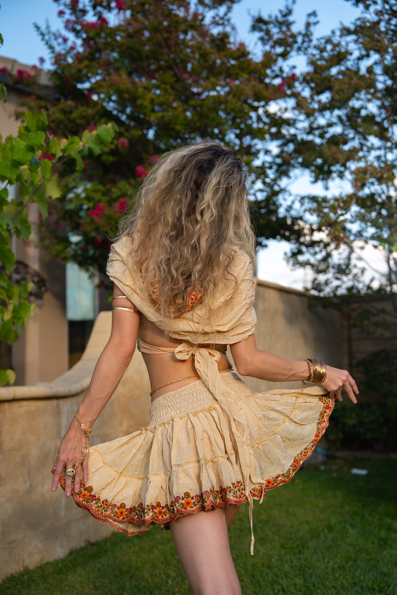 one of a kind up cycled vintage saree two-piece mini skirt set