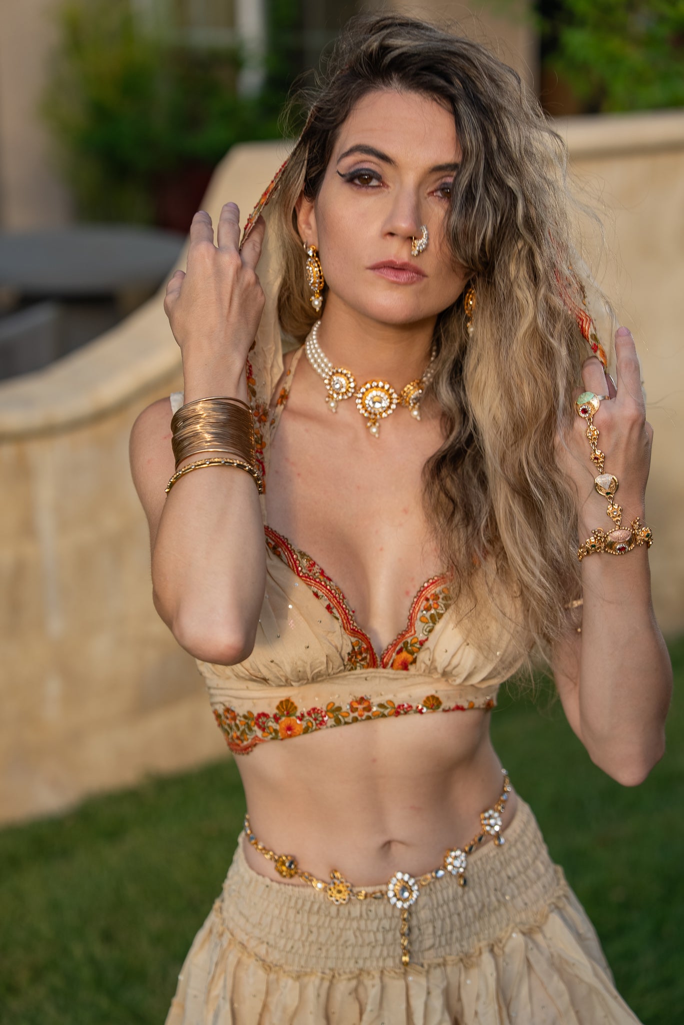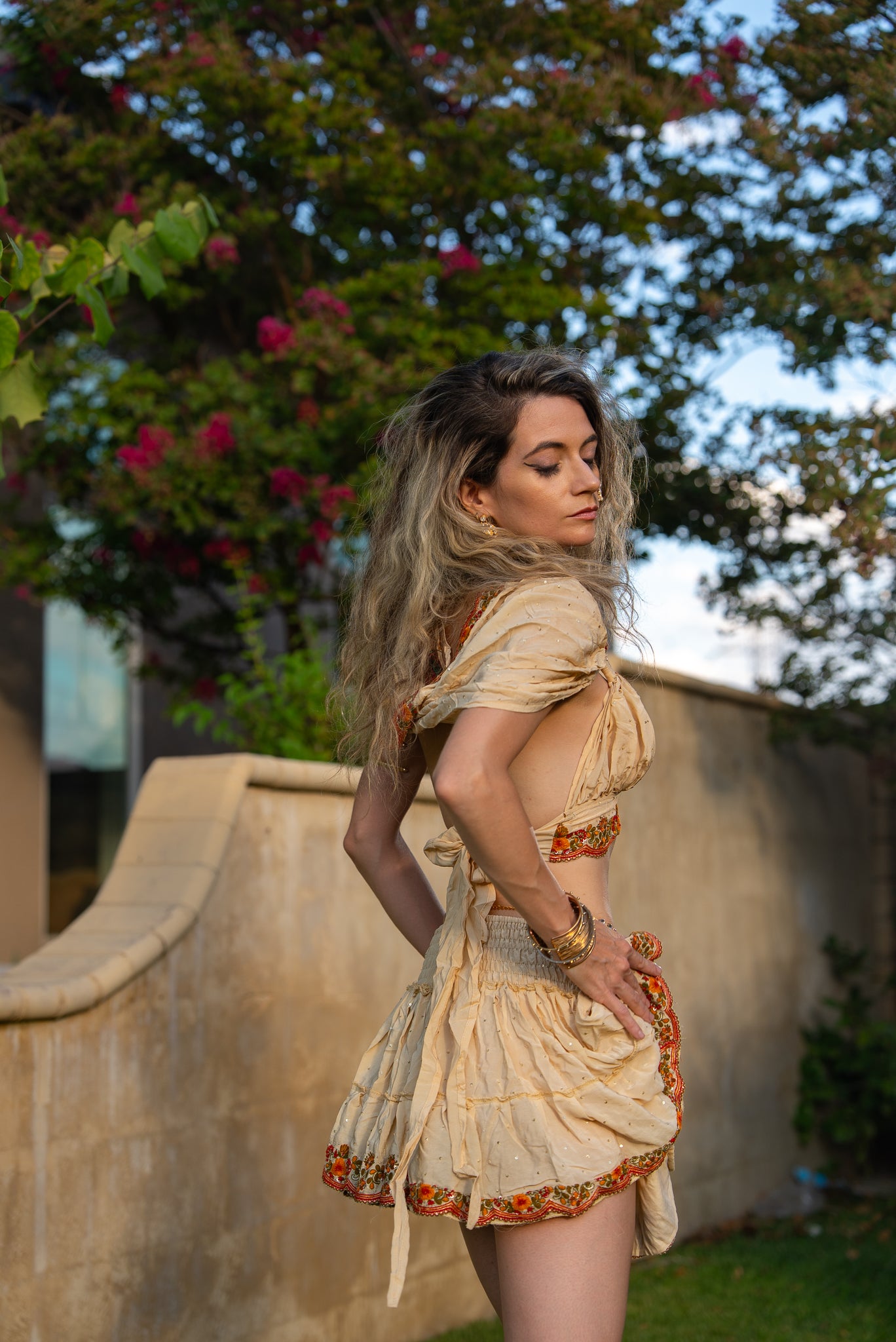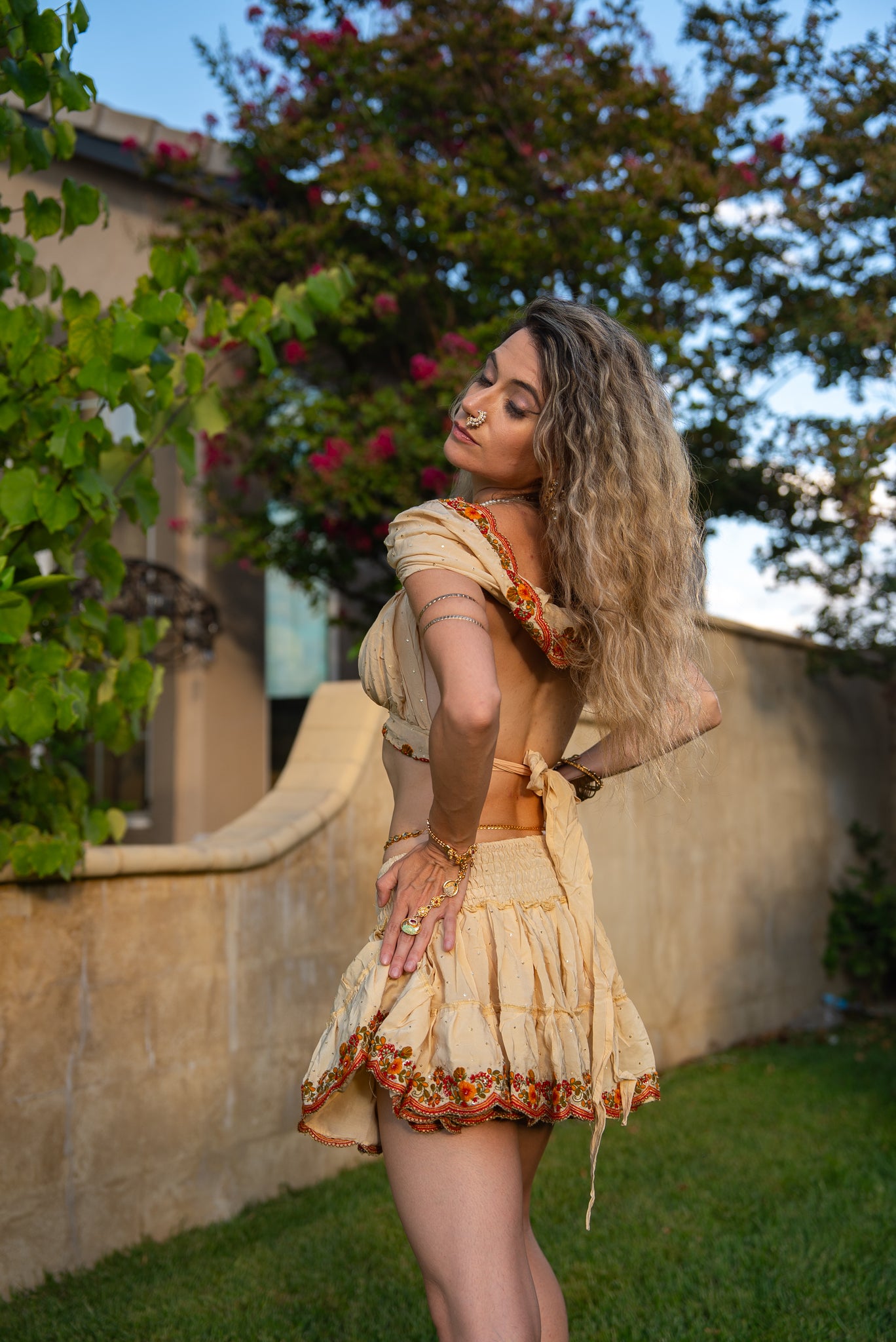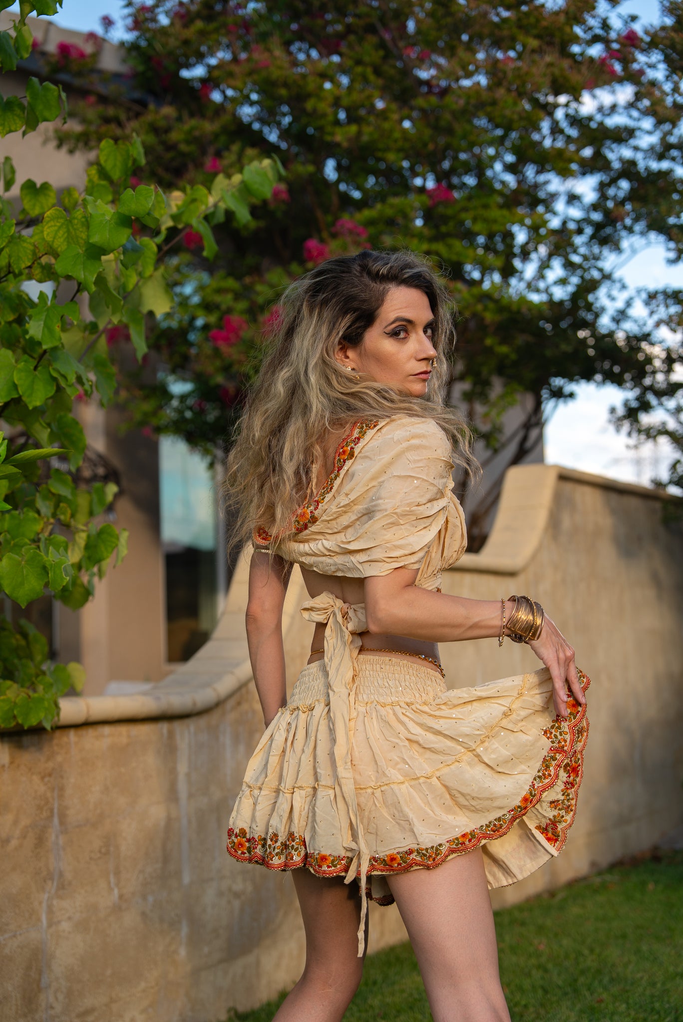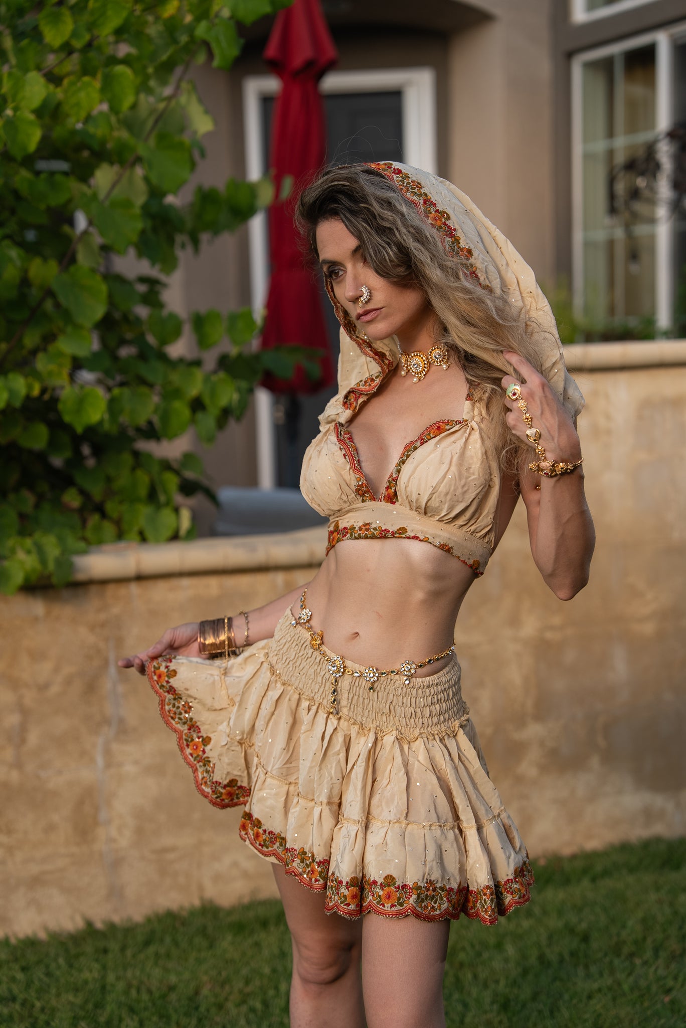 one of a kind up cycled vintage saree two-piece mini skirt set