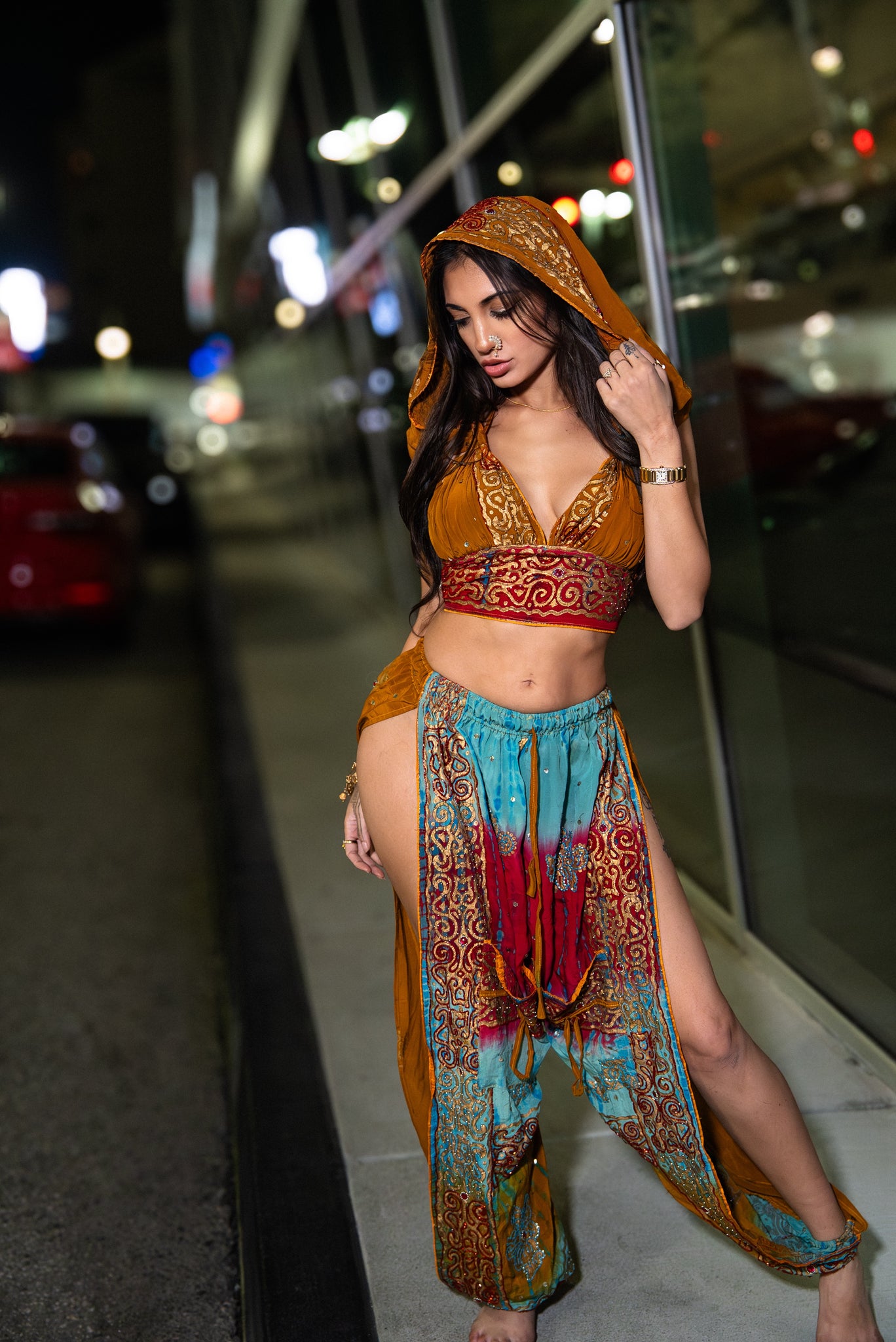 jasmine top features hood or off shoulder jasmine look. top ties behind neck and back to fit custom to your curves.